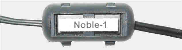 In the following figures we show the Noble1 with either one wire passing through it or with that same wired wrapped around the device so that it goes through the center of the Noble1, two times.